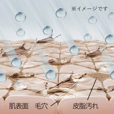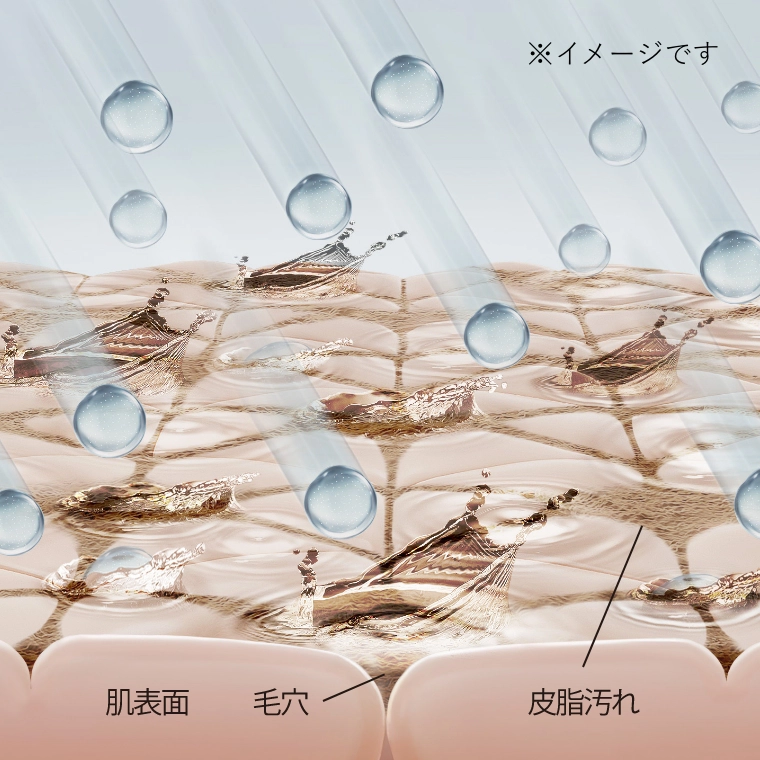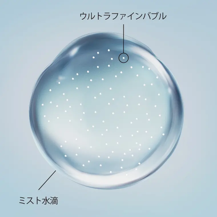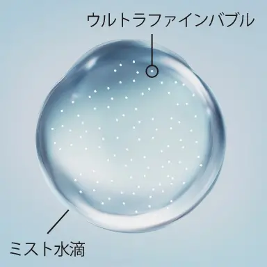 ウルトラファインバブルを含むミストの粒が汚れに連続して衝突することで、肌表面の汚れを落とします。 ![]()