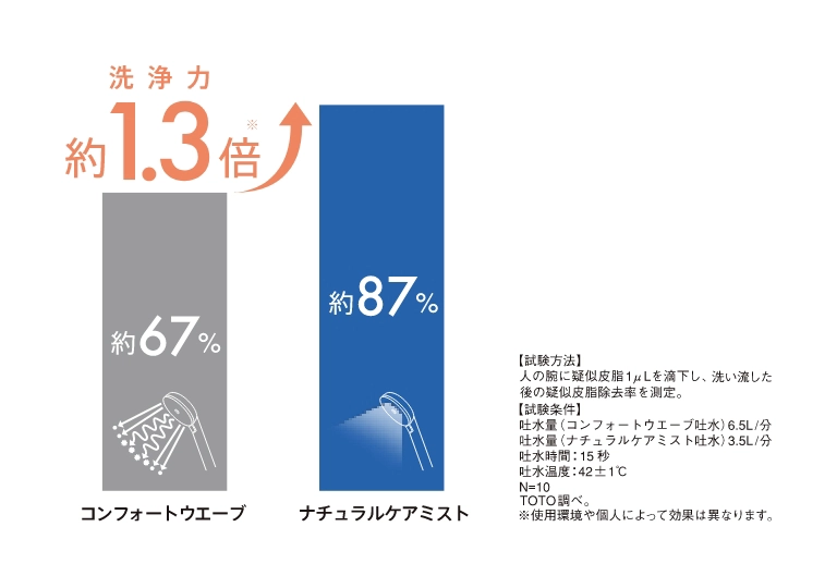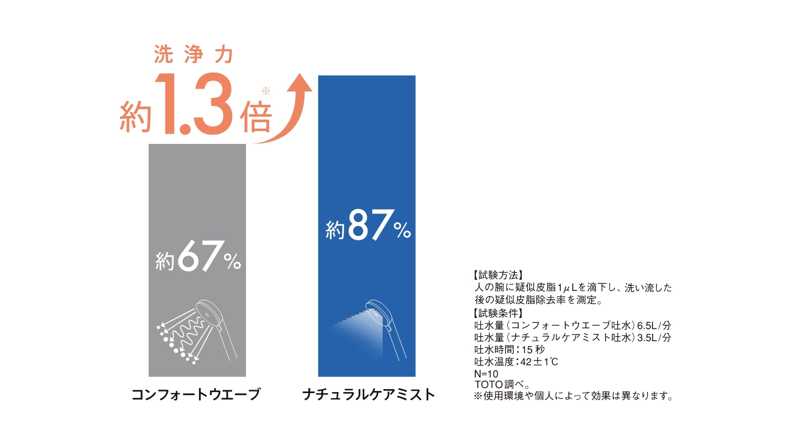 節水しながら軽快な刺激のある浴び心地を実現します。※1 従来品:TM690C1(1987~1998年商品)最適流量10L/分。コンフォートウエーブシャワー:TBV03456J(2024年~商品)最適流量6.5L/分。※最適流量とは(一社)日本バルブ工業会の定める方法に基づき、社内モニターにて測定した「一番使いやすいと感じる流量」のこと。 ※お客様の使用状況によっては節水量がばらつく場合があります。