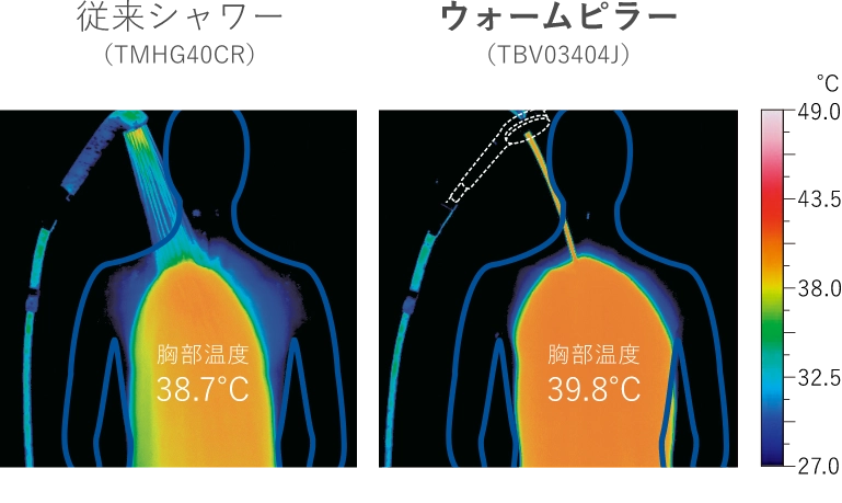 湯船につかるような高い温まりを実感できます。[測定条件] マネキン胸部に300㎜離した状態で水を流し吐水10秒後の温度を測定。室温:22℃~24℃ 水温:42℃ 流量:8.3L/分