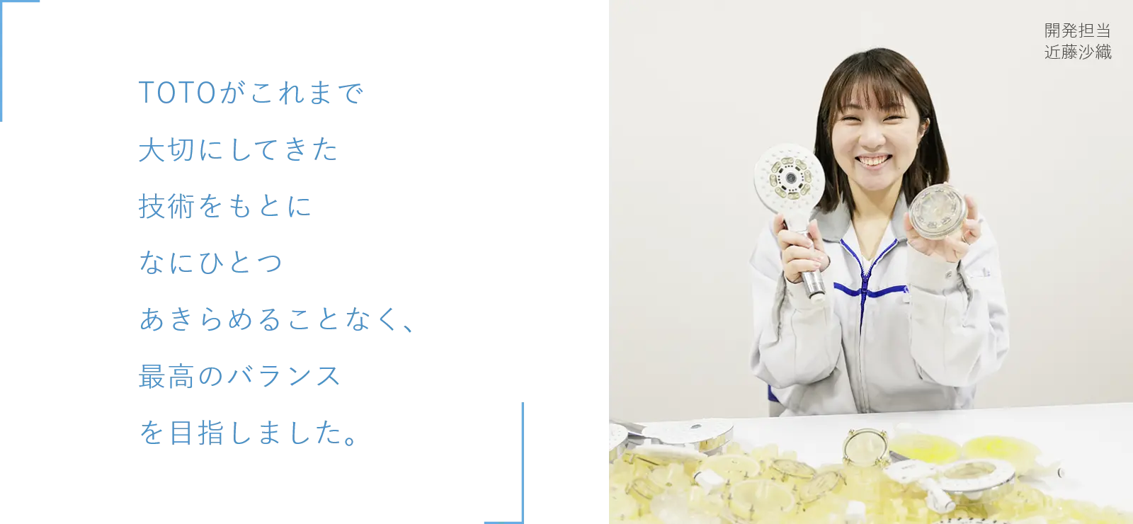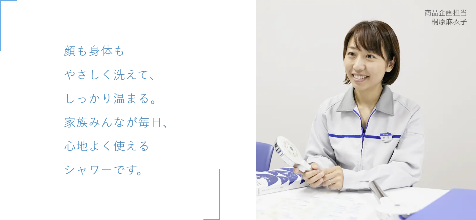 「大切にしたのは、直接顔に浴びたときの肌当たりのやさしさと、洗浄力の両立。また、身体の汚れをしっかり落とし、じっくり温まることもできる。男性も女性も、家族みんなが笑顔になれる、そんなシャワーを目指しました」
