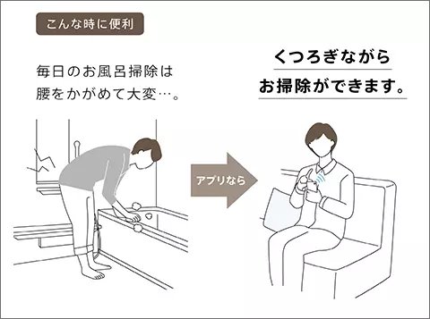 ボタン1つで床や浴槽を自動洗浄できる「床ワイパー洗浄(きれい除菌水)」「おそうじ浴槽」を遠隔操作でもっと便利に。面倒なお掃除がネックになってお風呂を十分に楽しめなかった方におすすめです。