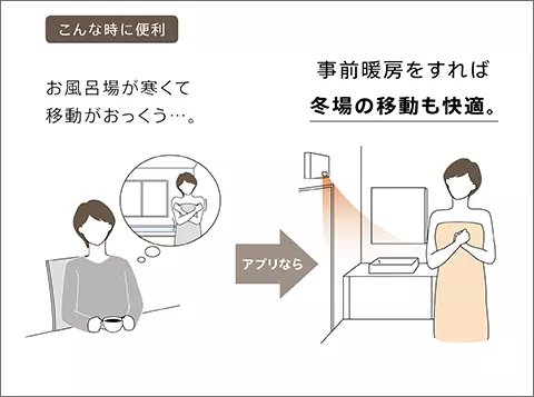 ※タブレット端末には対応していません。 ※つながる快適セットをご利用にあたり必要なものは以下の通りです。スマートフォン・専用アプリ「おふろ」・マルチリモコンになる組み合わせの各オプション・無線LAN環境。詳しくは「つながる快適セット」設置必須条件についてをご確認ください。