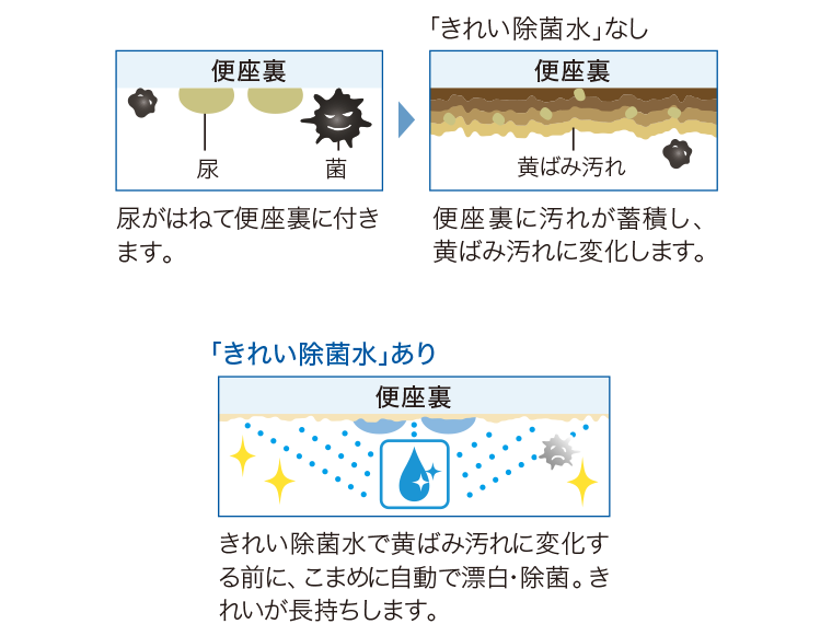 便座裏の先端部分の汚れを、使うたびにしっかり漂白・除菌※1 トイレの使用後に掃除をしないと、汚れがこびり付きます。