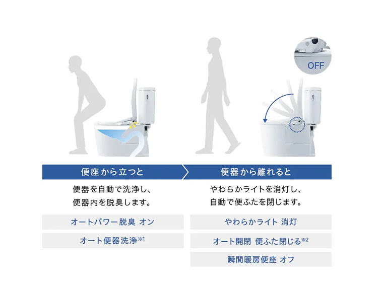 便座から立ち上がると、便ふたが自動で閉まったあと便器洗浄します。リモコンの便器洗浄ボタンを押すことでも、便ふたが閉まったあと便器洗浄します。