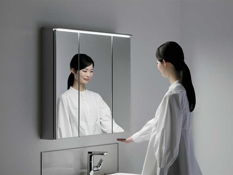 照明のオン・オフはセンサーに手をかざすだけのタッチレスで衛生的。石けんや水でぬれた手でも操作がスムーズです。