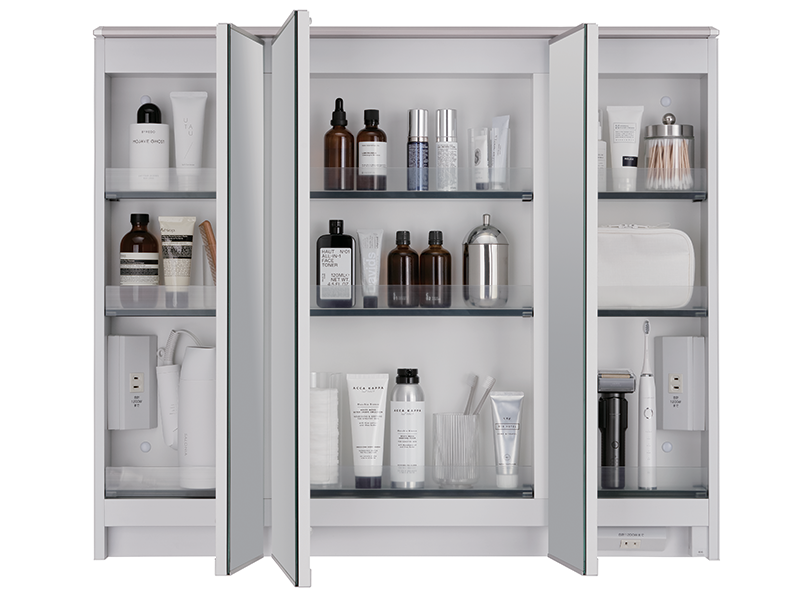 両側の鏡が内側に開き、合わせ鏡として使えます。使いやすさ、デザイン、収納のすべてにこだわりました。