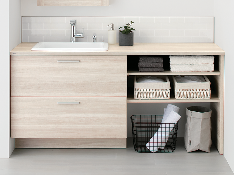 けこみ部分が奥まった浮遊感のあるデザイン。キャビネットの側板も木目調で家具のような統一感があります。