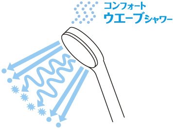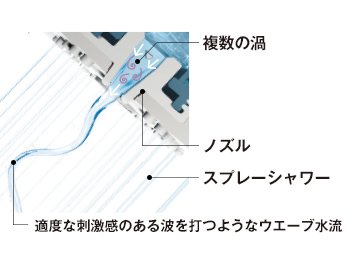 TOTO独自のノズルで大粒の水玉をスイングしながら勢いよく吐水。 スプレーシャワーとミックスし、適度な刺激のある浴び心地で節水を実現します。