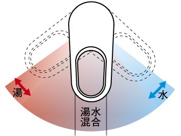 よく使われるレバー中央部では水と湯が混ざって出ます。例えば、しゃもじをぬらすときでもレバー中央で水を出すと、給湯機が作動していることがあり、お湯のムダ遣いに。