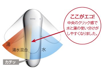 レバー中央部にクリック感を作り、水とお湯の境目を明確にしました。これにより、無意識のうちに給湯器が作動してしまうのを防げます。