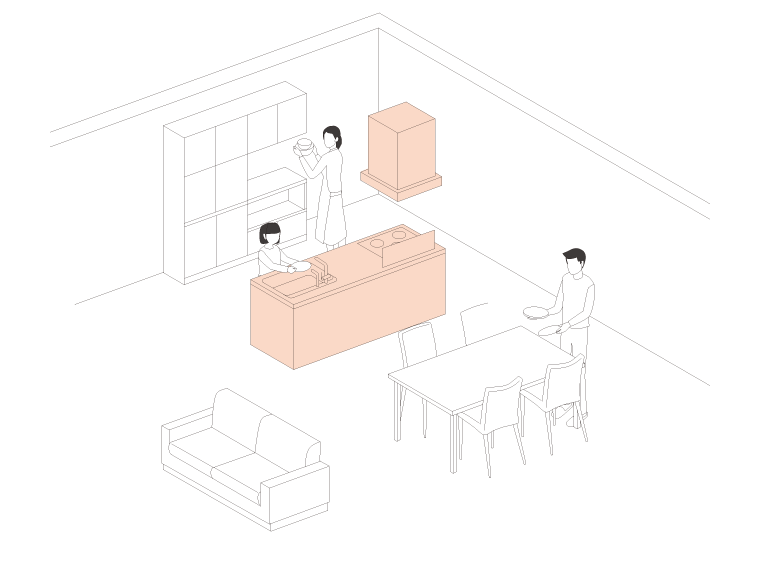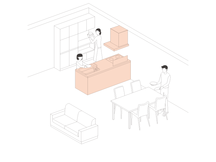 対面(アイランド)キッチンの片面を壁に付けたレイアウト。アイランドよりもコンパクトなスペースで、開放感のある空間を実現。ダイニングからキッチンにアプローチ可能で、配膳や後片付けがスムーズです。