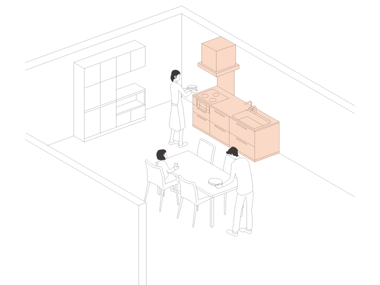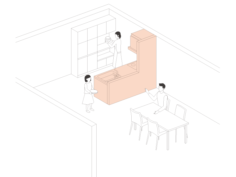 キッチンを壁に付けたベーシックなレイアウト。独立したキッチン空間や、ダイニングと一緒の空間にもできます。ダイニングを近づければ、調理・配膳・後片付けの一連の動作がスムーズです。