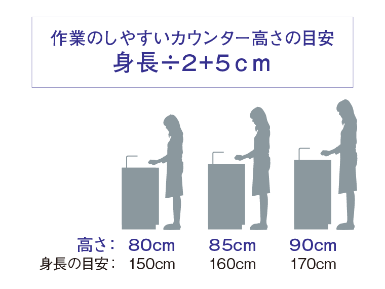 カウンターの高さは80cm・85cm・90cmの3段階が基本仕様。図のように、身長160cmなら85cmが目安です。