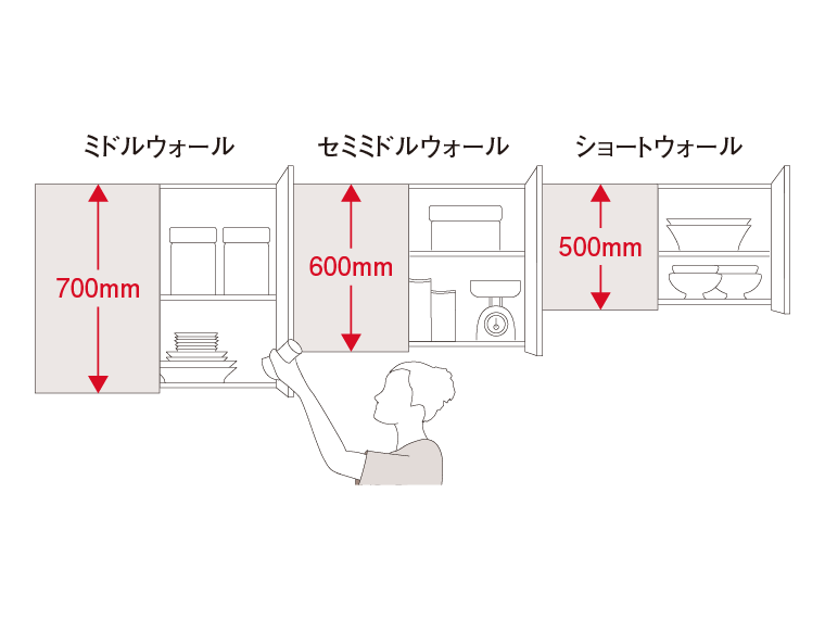 収納物の量・使い勝手・インテリアなどに合わせ、ショート・セミミドル・ミドルの3タイプの高さから選べます。