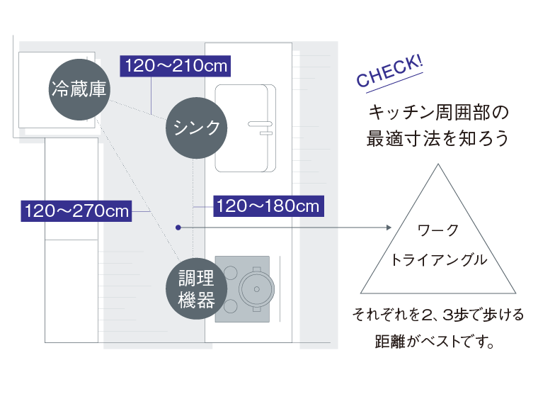 家事効率アップのコツは、冷蔵庫・シンク・調理機器の3つの距離。調理や片付けに必要なスペースを確保して、使いやすい空間を計画しましょう。