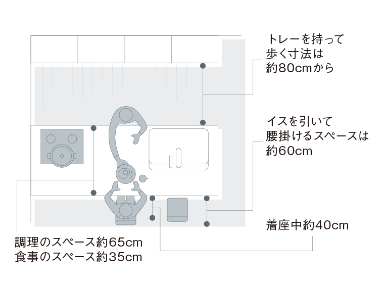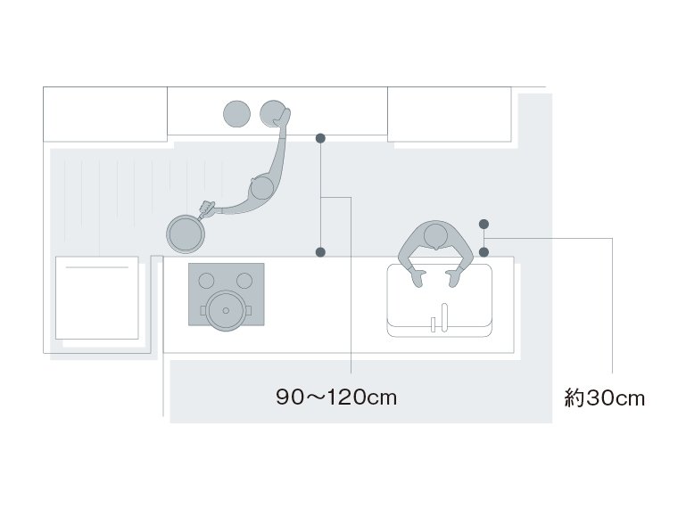 カウンターを並行して配置する場合、間隔は90〜120cmが目安。
