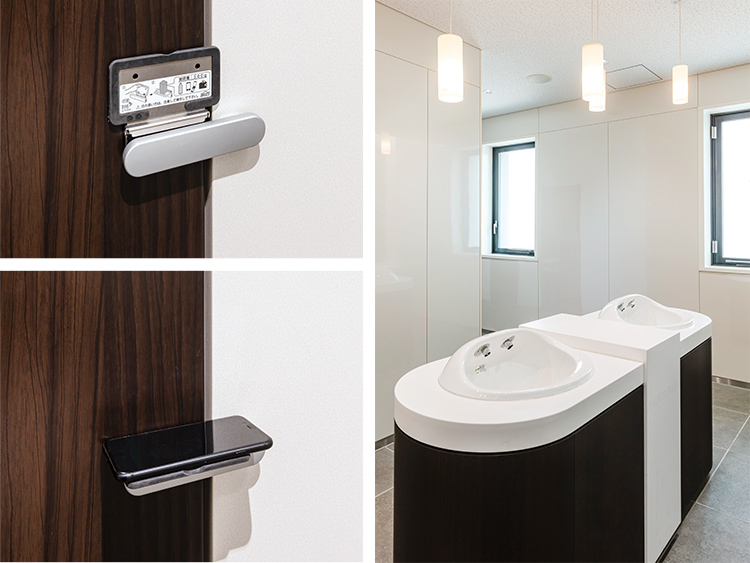 6:(左)個室ブースの鍵の上にスマホなどの一時置き台を設置。目に留まりやすく忘れ物予防に役立つ。
