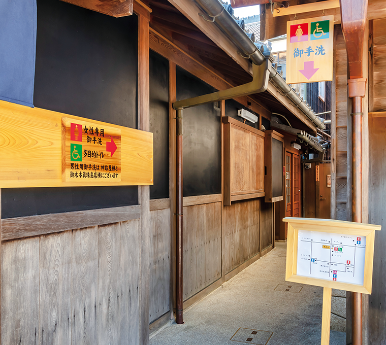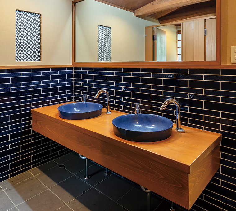 また、手洗いスペースは、おかげ横丁らしさを演出するため、5か所のトイレごとに近くの店舗などに合わせてバラエティ豊かな意匠で演出しています。