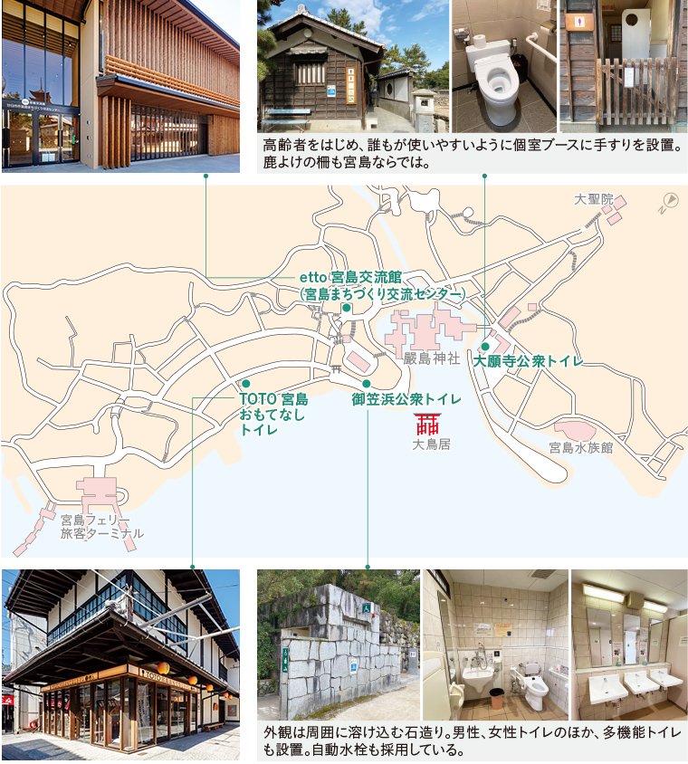 そんな日本屈指の国際観光地では、近年、公共トイレのリニューアルや新設が続いています。廿日市市が管理するものに限っても、大願寺公衆トイレと御笠浜公衆トイレを改修し、TOTOと連携して整備した「TOTO宮島おもてなしトイレ」を新設。2021年開館の「etto宮島交流館(宮島まちづくり交流センター)」にも最新のトイレ設備を導入しました。