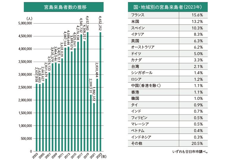 江戸時代、全国を行脚した儒学者の林春斎が「日本国事跡考」に記したという日本三景。その一つである安芸の宮島(広島県廿日市市)には現在、年間460万人を超える観光客が訪れています。1996年には象徴である嚴島神社が世界文化遺産に登録され、外国人からの人気も極めて高い観光地です。実際、コロナ禍が落ち着いて観光客の足が戻る中、外国人の回復状況は予想以上。時期や時間帯によっては、日本人を見つけるのが難しいほどです。