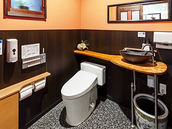代表の坂本恭弘さんはそう言います。壁や窓枠に使われた木材が落ち着いた雰囲気を演出し、和風の手洗い鉢も印象的。荷物置きはしゃもじの形をしています。