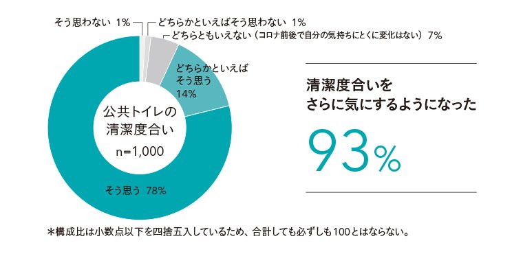 調査では訪日中のインバウンド1000人に対して、新型コロナウイルス感染症の流行の前後を比較したとき、自分の意識がどのように変わったと感じるかを聞きました。このうち、公共トイレの清潔度合いについて尋ねた問いでは、「清潔度合いをさらに気にするようになった」と答えた人の割合は「そう思う」「どちらかといえばそう思う」を合わせて93%に上りました。