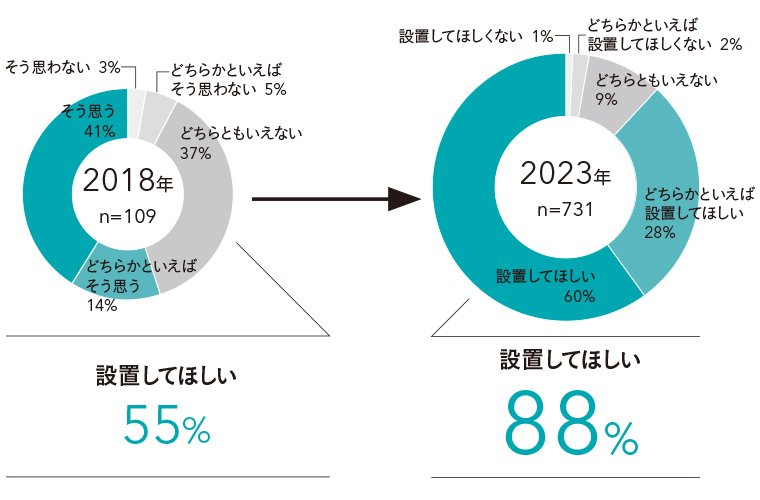コロナ禍前後を比較すると、温水洗浄便座の設置を求める声が高まっています。TOTOでは2018年にもインバウンド向けの意識調査を実施しています。今回(2023年調査)と2018年調査でともに「訪日中に利用するトイレには、温水洗浄便座を設置してほしいか」と尋ねたところ、2018年調査では「設置してほしい」の声が55%だったのに対して、2023年調査では88%にまで上昇しています。