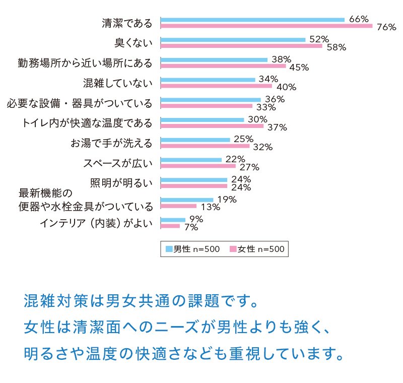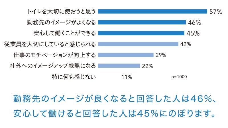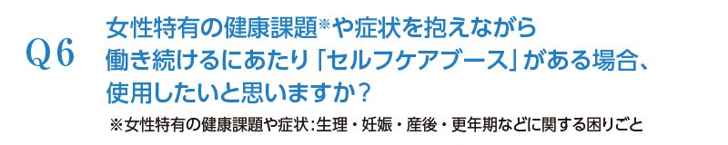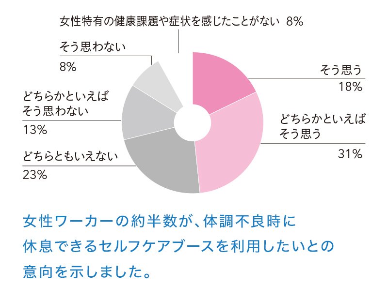 人手不足が深刻化している今、従業員が心身の不調によってパフォーマンスが低下したり、離職したりすることは、企業にとって大きな損失です。本調査では、心身の不調で思うように業務に取り組めない日があると感じている人が半数近くに上りました。特に女性は特有の健康問題(生理、妊娠、更年期など)により、仕事に思うように取り組めない時期が生じます。広めのトイレブースに洗面器や飲み水などがあれば腹痛や吐き気を伴う不調時に休憩場所として使えます。