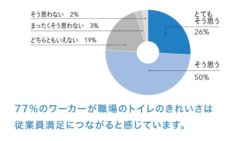 そこで気にしておきたいポイントの一つが、誰もが毎日利用するトイレの環境です。TOTOの工場ワーカー調査(以下、本調査)では約半数のワーカーが「職場のトイレがきれいで使いやすいと、安心して仕事に取り組める」と感じています【Q1】。さらに実に約77%ものワーカーが「職場のトイレのきれいさが従業員満足度に繋がる」と回答しています【Q2】。