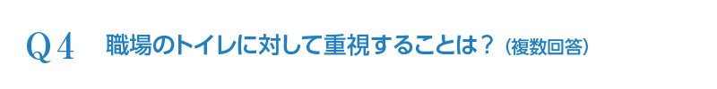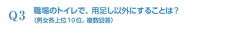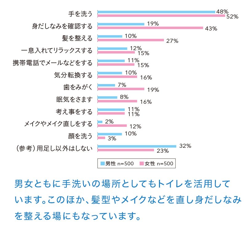 トイレは用を足せばそれでいいのでは?と考えるかもしれません。しかし本調査によると、職場のトイレはワーカーにとって多用途な空間として活用されている様子がうかがえます【Q3】。例えば作業着の乱れを直したり、仕事の合間にサッと歯磨きをしたりと、その利用方法は十人十色。個室で一人きりになる時間が、ちょっとした息抜きになるという人もいます。また工場で働いている人にとっては、作業で手に付着した汚れを落としたりする貴重な場所にもなっているようです。