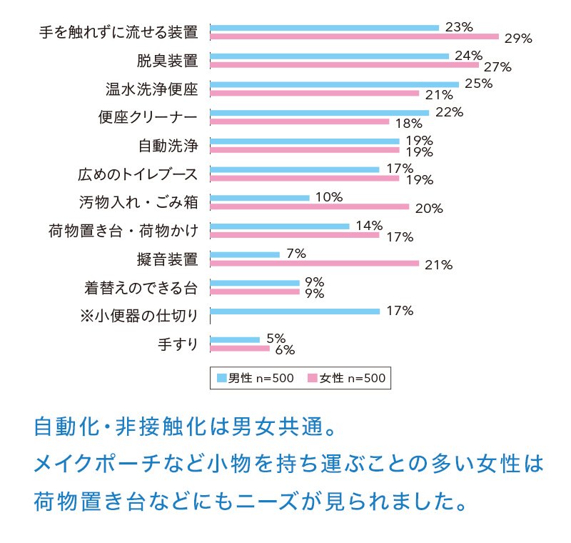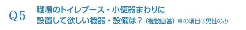 トイレブースや小便器まわりにほしい設備は男女で違いがみられます。男性は「温水洗浄便座」や「便座クリーナー」が、女性は「手を触れずに流せる装置」や「脱臭装置」「荷物置き」などが上位になりました【Q5】。また洗面まわりでは男女ともに「お湯が出る水栓」や「自動水栓」「温風乾燥機」などを求める声が多く、快適に手洗いしたいという強いニーズがうかがえます。また工場や倉庫のトイレは屋外に設置されていることも多いため、便座の暖房や温水などの備えがあると冬にも安心して使えるという声もありました。