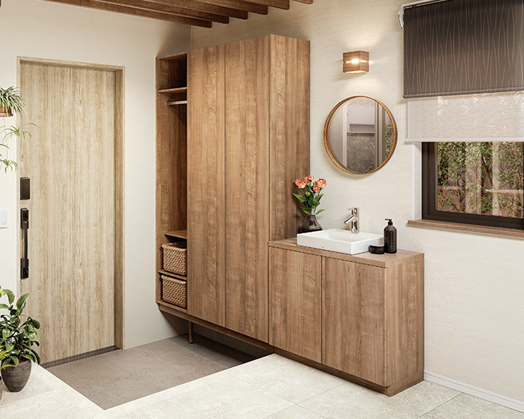 玄関ドアは便利で安心の顔認証自動ドアで出入りが楽な引き戸タイプに。さらに手洗い器の設置やコート掛けのある玄関収納で、帰宅時にも来客時にも安心で快適な場所にしました。