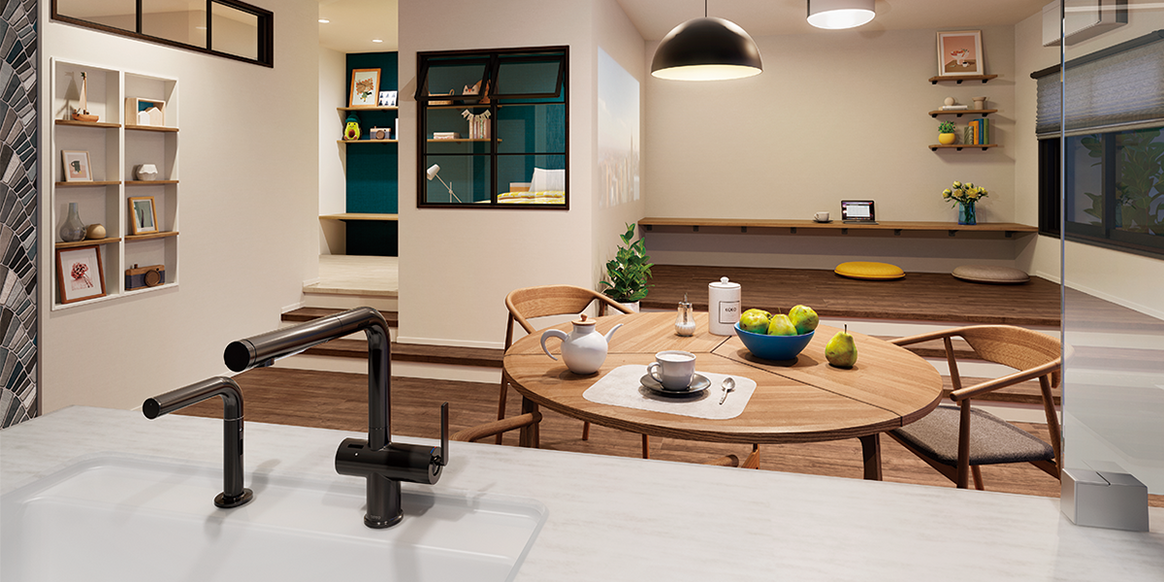 家族が自然に集まり会話の弾む、アイランドスタイルのフラット対面型キッチン。背面には大型の収納キャビネットも設置し、収納スペースもたっぷり確保。タッチレス水栓や「きれい除菌水」で、お手軽にきれいをキープできるキッチンです。