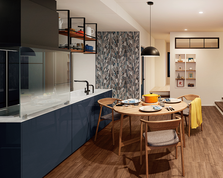 明るく落ち着いた木目調の床に、室内窓や飾り棚を採用したおしゃれなインテリア空間。