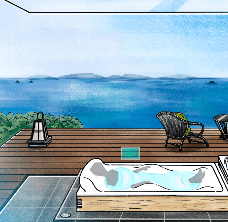 例えばジェットバスのようなものも欲しいですね。ただし、あまり強い刺激が好きではないので、柔らかい泡でマッサージしてもらえるような。さらに、バスタブは、取りたい姿勢に合わせて形が変わってくれるとか。背中の角度や頭の形にフィットしてマッサージしてくれたらいいですよね。お風呂に入っている想像をしていたら、リラックスしてきて、なんだか眠くなってきました。