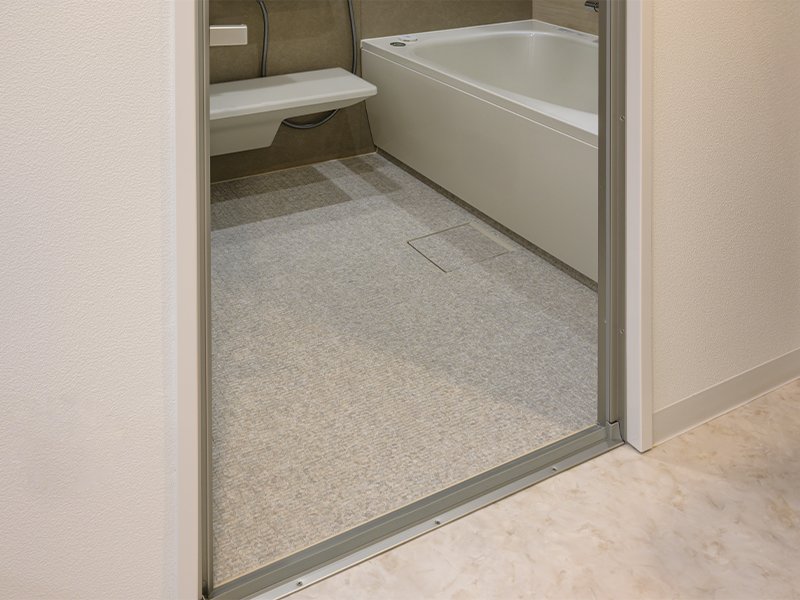 洗面脱衣室とほぼフラットに続く浴室。段差が解消されて、入浴時の身体的な負担が軽減されました。