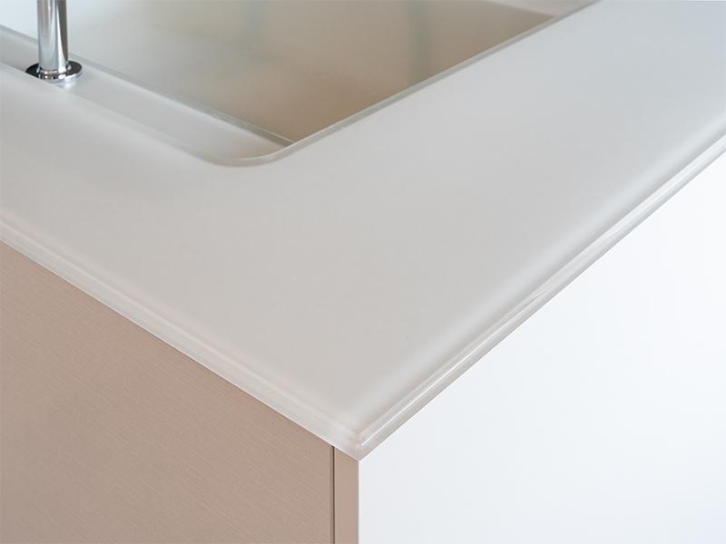 深みのある透明感が魅力のクリスタルカウンター。自然光や照明など、当たる光によって表情を変えます。