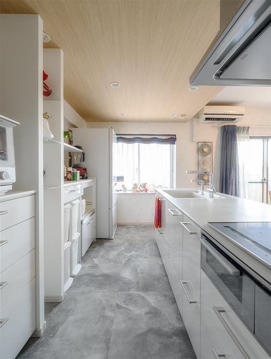 キッチン内の通路は広めに確保しました。両サイドから出入りできるアイランドスタイルになってから、ご主人も使った後の調理用具を洗うなど、食後の後片付けなどをさりげなく手伝ってくれるようになったそう。「オープンなキッチンだから、夫も入りやすくなったんでしょうね。調理のときも後片付けも、会話しながらできるのは楽しいですね」と奥様。