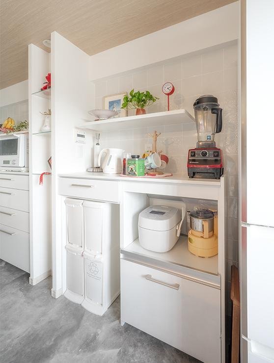 上部には、吊り戸棚の代わりに、オープンな飾り棚を配置しました。家電や雑貨をなるべく白で統一し、ところどころに差し色の赤を入れるなど、ディスプレイ感覚で収納。調理も一層楽しくなる空間を演出しています。