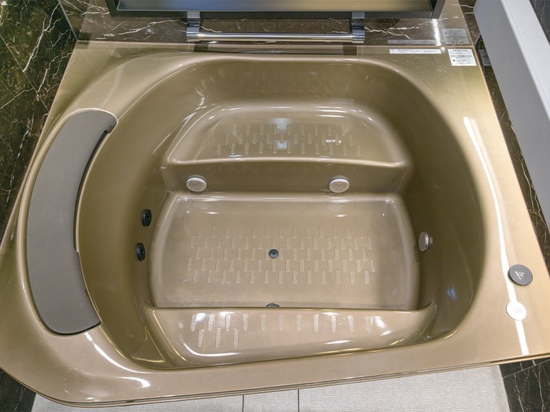 左右に大きくゆとりを持たせたファーストクラス浴槽(スーパーワイド/ステップ付き)。人間工学に基づき、身体をゆったりと包み込むような形になっています。