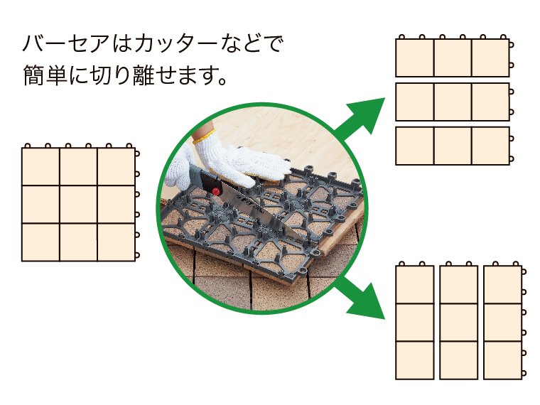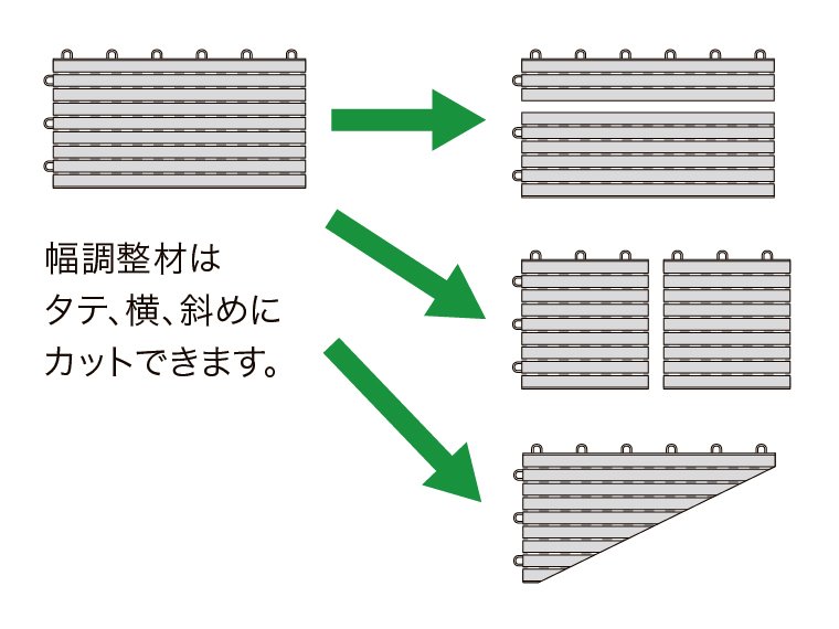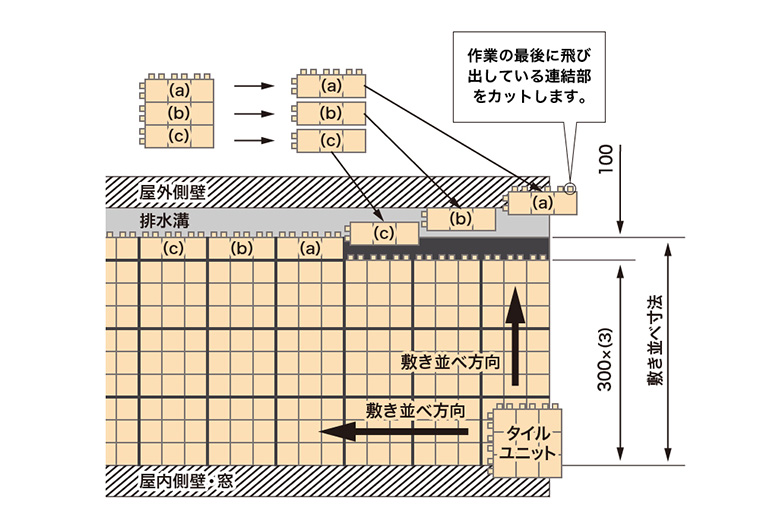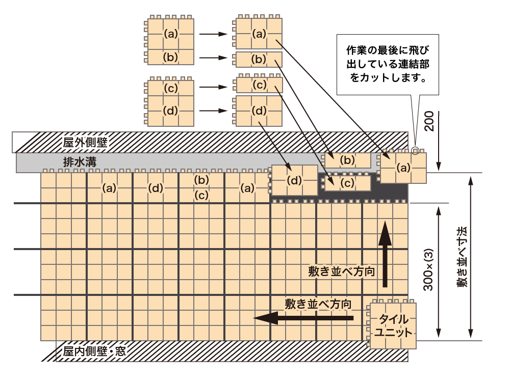 雨戸戸袋・樋落とし口・柱などの障害物がジャマで上手く張れないときは、まず、障害物の位置と寸法を図りましょう。障害物が30cmに満たない場合は、タイルユニットをカットするか幅調整材を用いて納めます。タイルユニットは目地の部分でカットできます。(カットしたタイルのユニットも切り方、敷き方を工夫することでご利用になれます。)タイルでもよけられない時は、16.5mmピッチの幅調整材でピッタリきれいにおさまります。