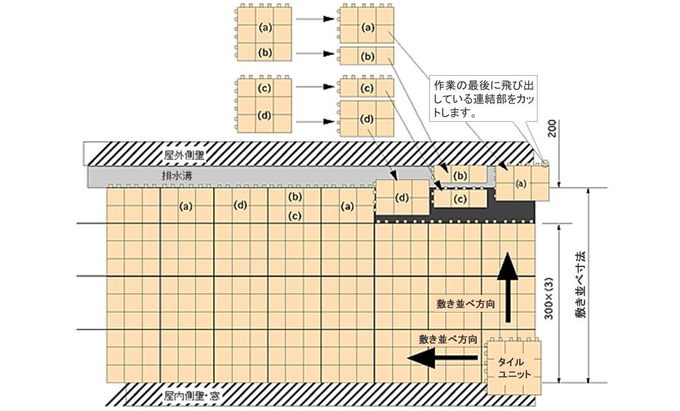 雨戸戸袋・樋落とし口・柱などの障害物がジャマで上手く張れないときは、まず、障害物の位置と寸法を図りましょう。障害物が30cmに満たない場合は、タイルユニットをカットするか幅調整材を用いて納めます。タイルユニットは目地の部分でカットできます。(カットしたタイルのユニットも切り方、敷き方を工夫することでご利用になれます。)タイルでもよけられない時は、16.5mmピッチの幅調整材でピッタリきれいにおさまります。