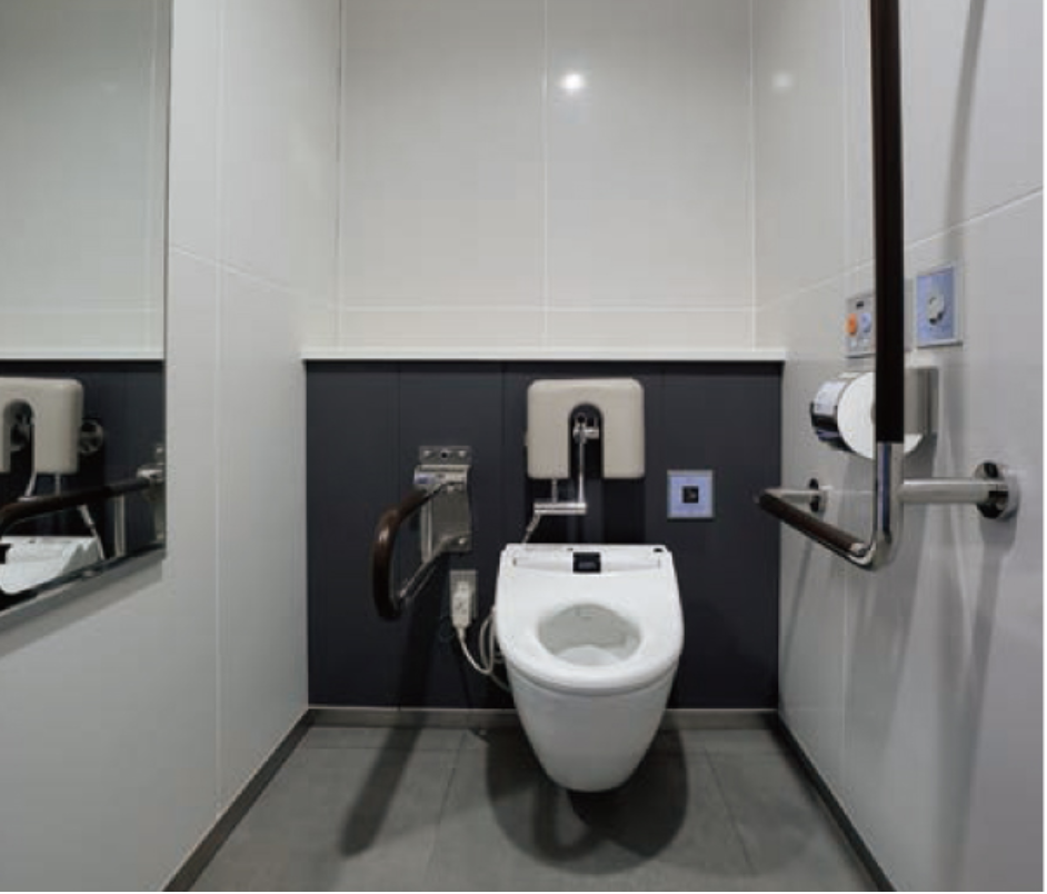 お客様が気持ちよく利用できる、明るく清潔で、開放感のある空間を目指しました。目地のない大型セラミックパネルは、清潔感はもとより、効果的に照明を配置することで全体的に「白」が強調され、とても開放的な空間が実現しました。また、以前に比べ、消臭効果や、メンテナンス性の向上も実感しています。