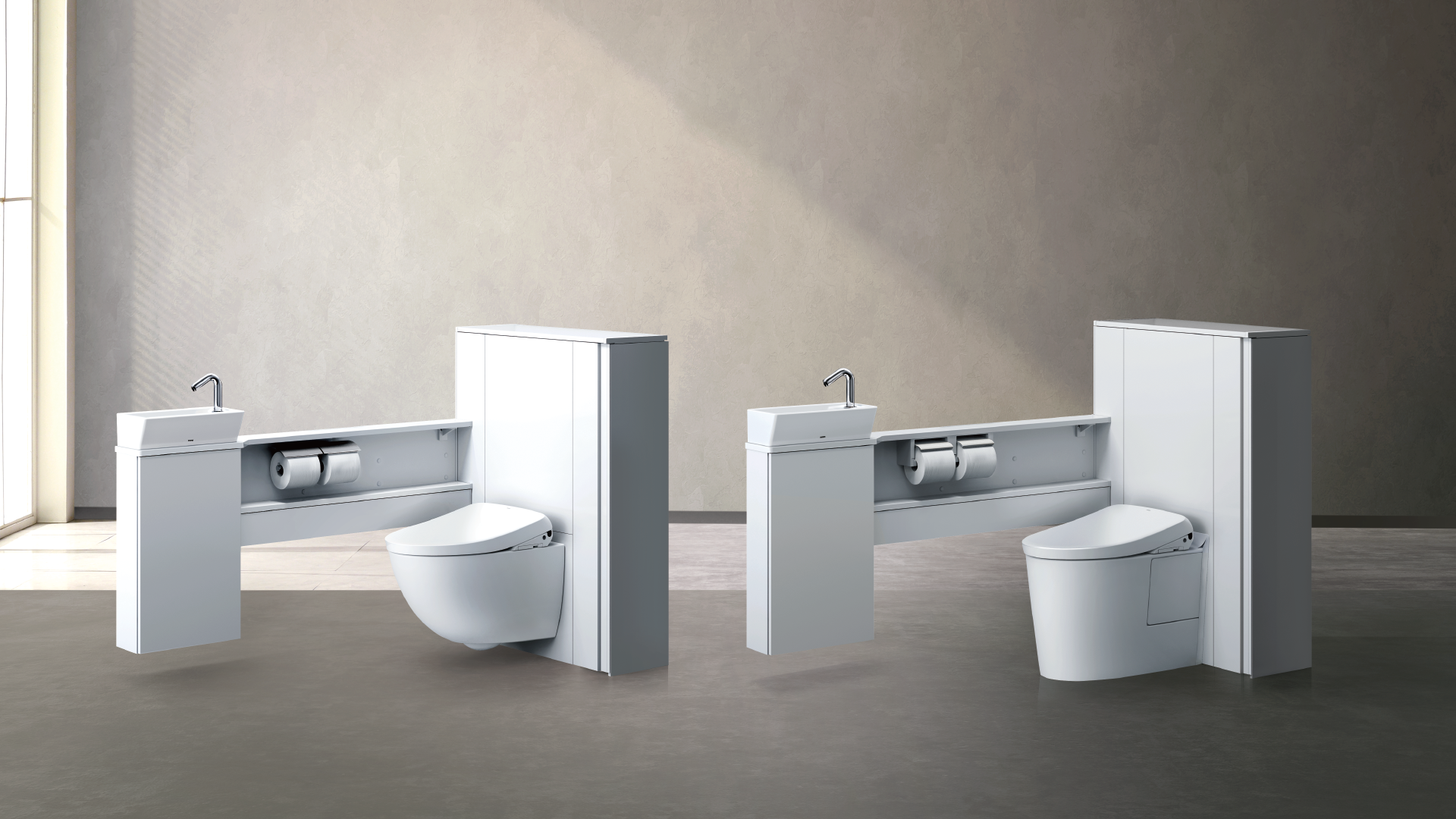 レストルームに必要な器具をパッケージした、レストパル。 さらに、フローティングデザインのレストパルFは、たっぷりの収納力や機能性はそのままに、 シンプルでデザイン性のある空間を実現します。