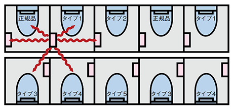 リモコン使用の「ウォシュレット」を左右、または対面方向と2台以上並べて設置する場合、隣のリモコンの信号を受け誤作動するおそれがあります。相互の干渉を防止するため、リモコンの信号が異なるタイプに変える必要があります。らくらくリモコンなども同様です。