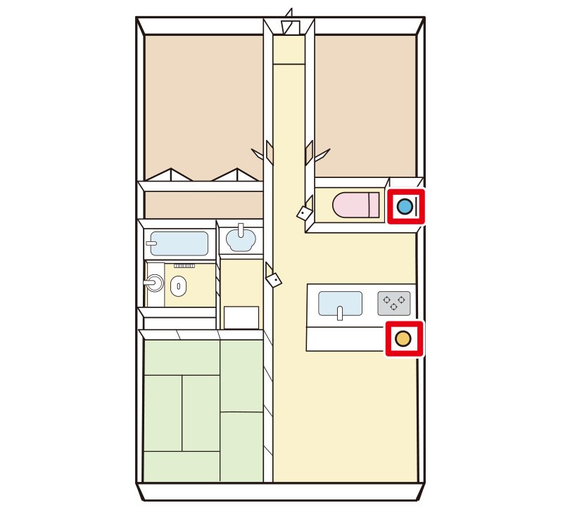 平面図で水まわりの位置、立て配管の位置を確認します。立て配管は共用部ですので、専有部の配管に合流させます。