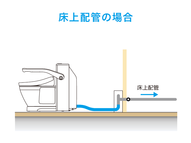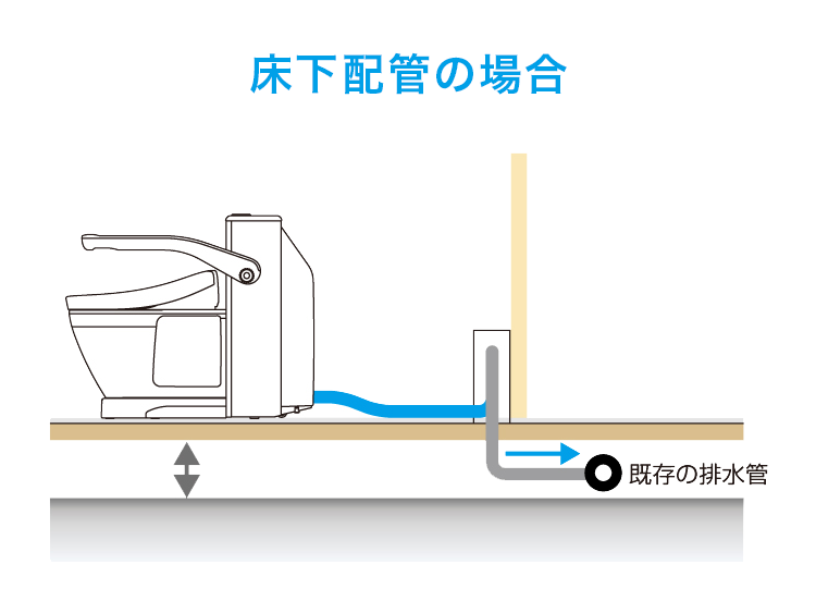 ベッドサイド水洗トイレは、排水管の口径が小さく、勾配なし※1で設置できます。床下スペースが狭い場合や床下スペースがない場合なども後付け設置ができます。