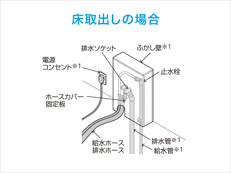 新築から後付け設置までさまざまな設置条件に対応できます。配管は床・壁ともに取出しできます。ふかし壁・点検口・ホース取出し口・配管材は現場手配となります。