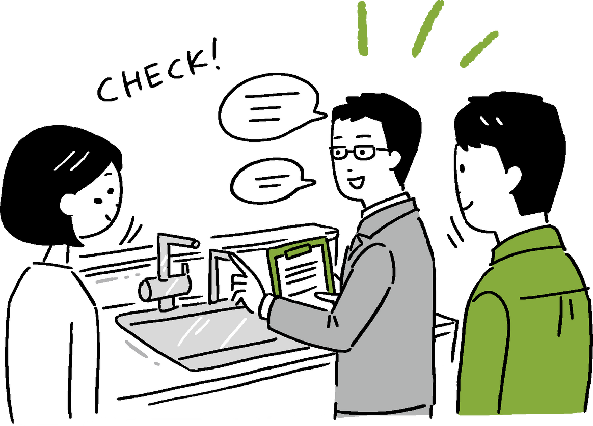 引き渡しでは、まず見積り内容がきちんと実施されているかどうか、傷などの不具合がないかどうか、工事箇所をすべて見て回り確認していきます。もし不具合が見つかったらその場で伝え、補修工事をお願いしましょう。そのほか、使い方やお手入れ方法についてわからないことがある場合も、ここで解決しておきましょう。