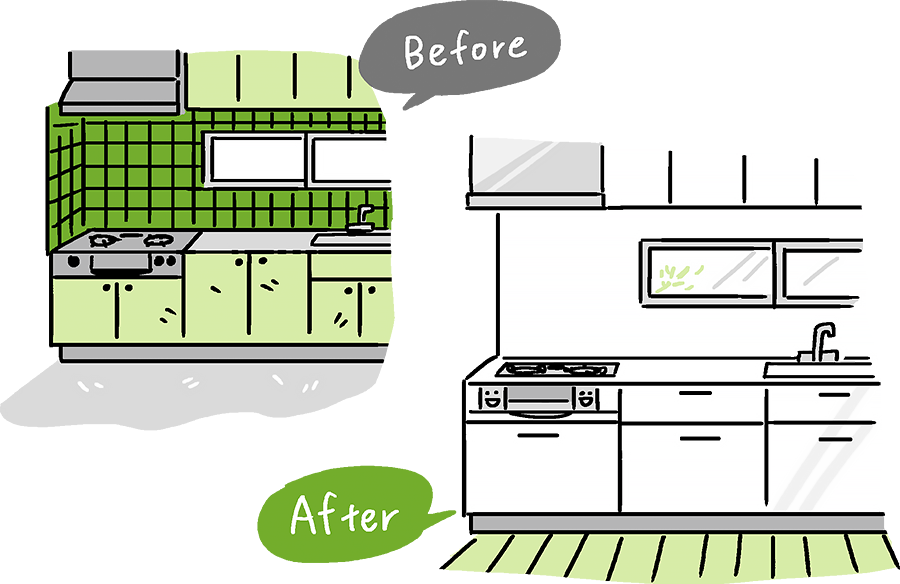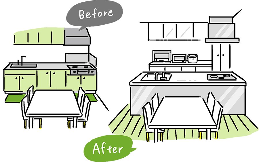 キッチン本体を丸ごと交換リフォーム | 本体交換に加えて、床壁天井の空間全体も一新するリフォーム | キッチンの位置やレイアウトを変えて、お部屋からの動線を良くしたり、空間を広くするなどの大規模リフォーム |